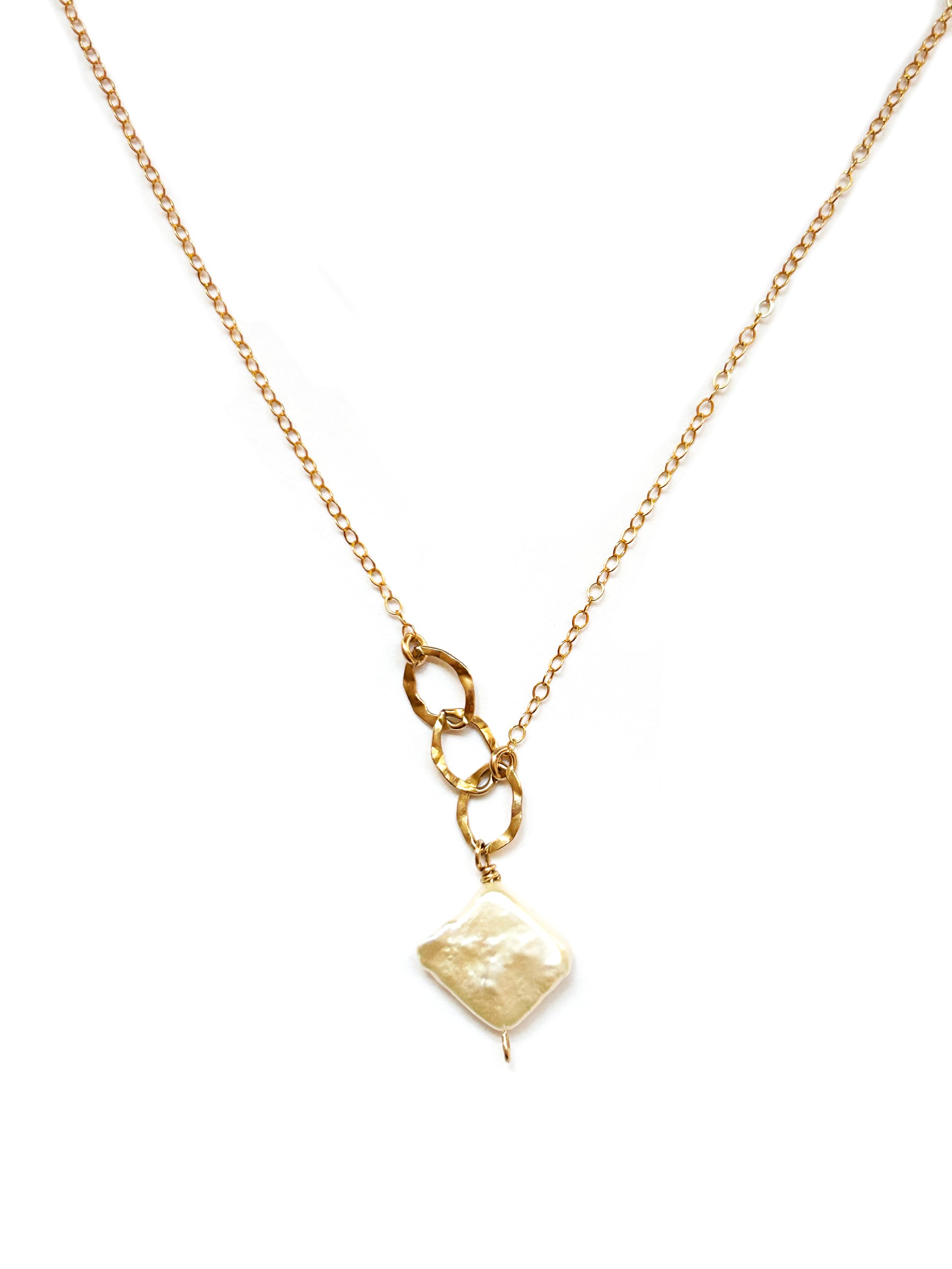 These rough cut pearl diamond shape drops have a soft white sheen with no two being exactly alike. They are dropped off of 14K Goldfill chain with textured link accents. Limited quantity. Approx 17"