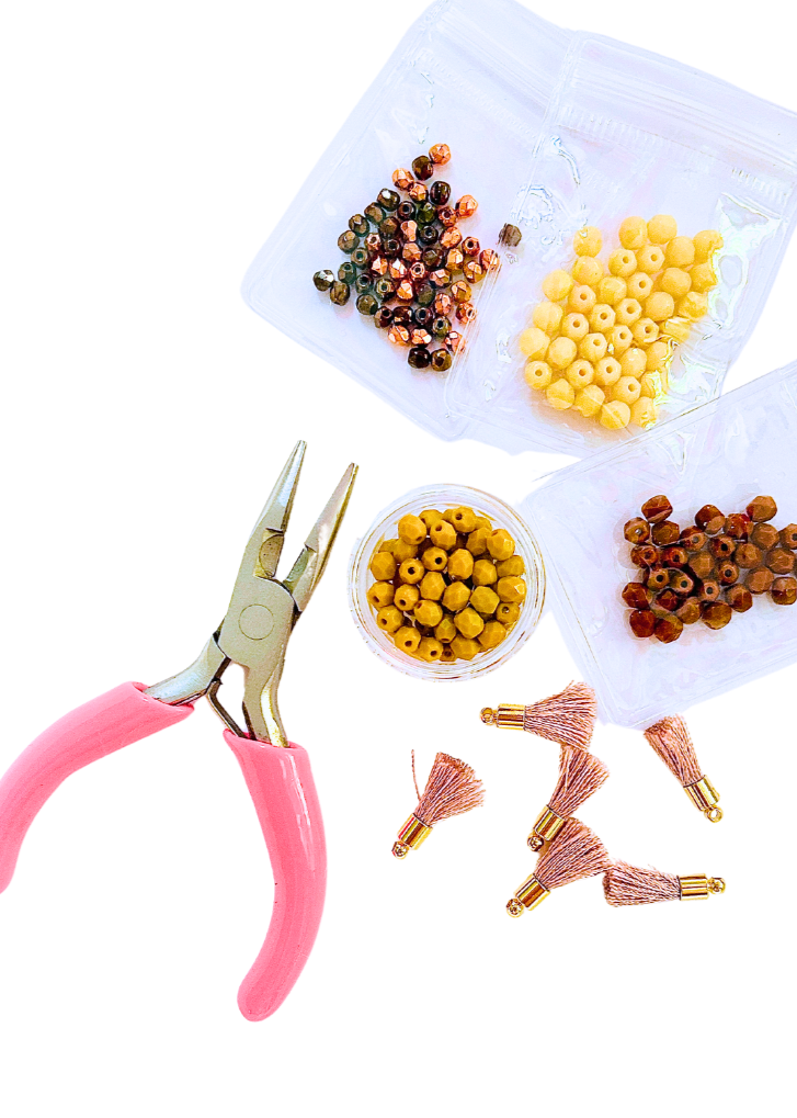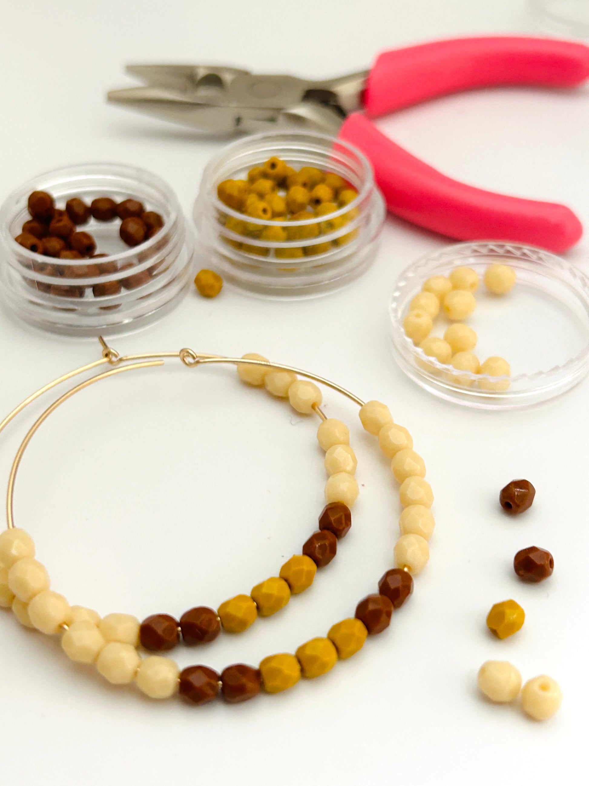 This DIY Afternoon Sun beaded hoops kit features a selection of beads in earthy tones and blush tassels to mix and match with the beads.