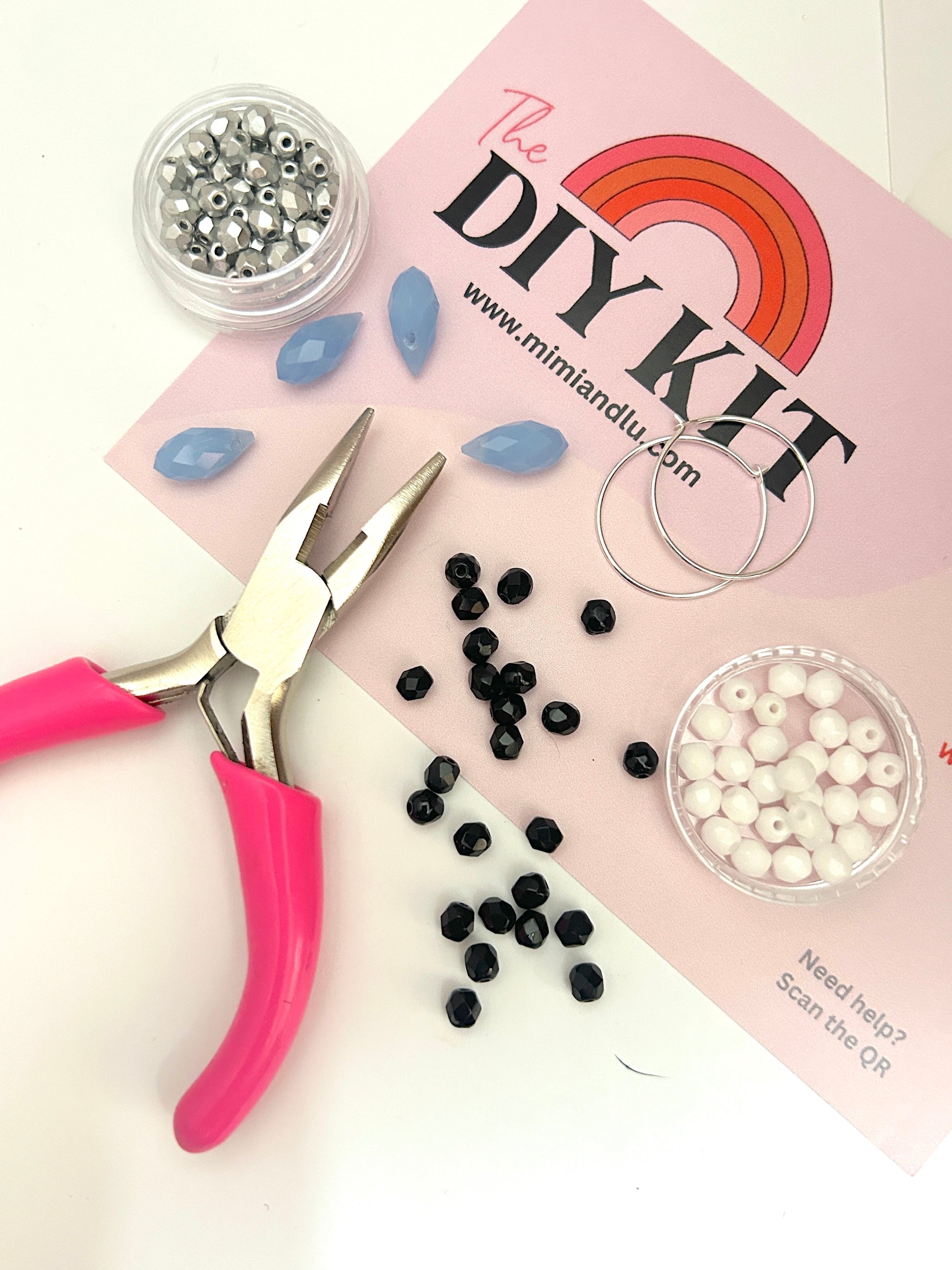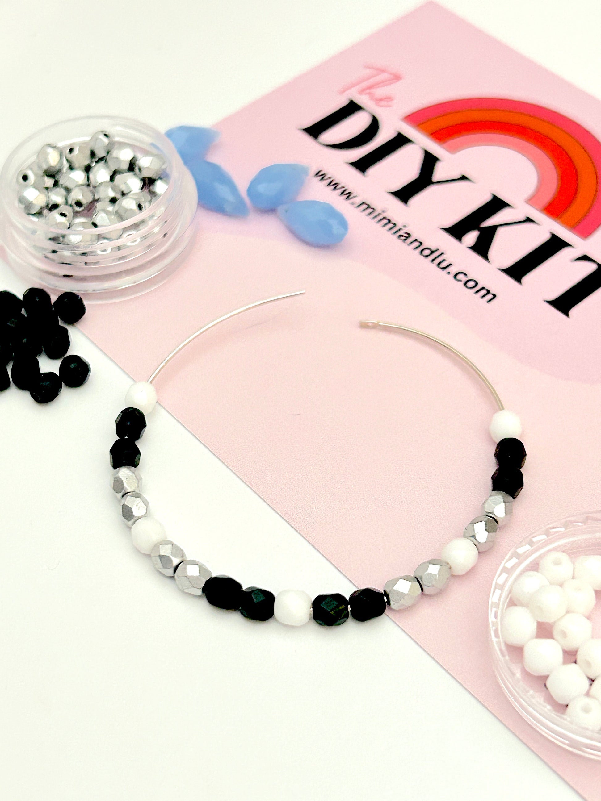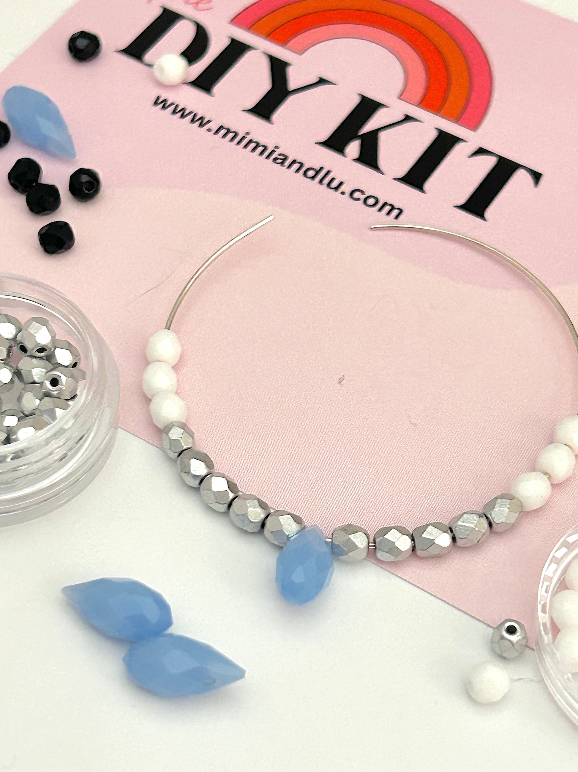 This DIY Electric beaded hoops kit offers an abundance of bright white, jet black, shiny silver and periwinkle bead and drop options to mix and match.