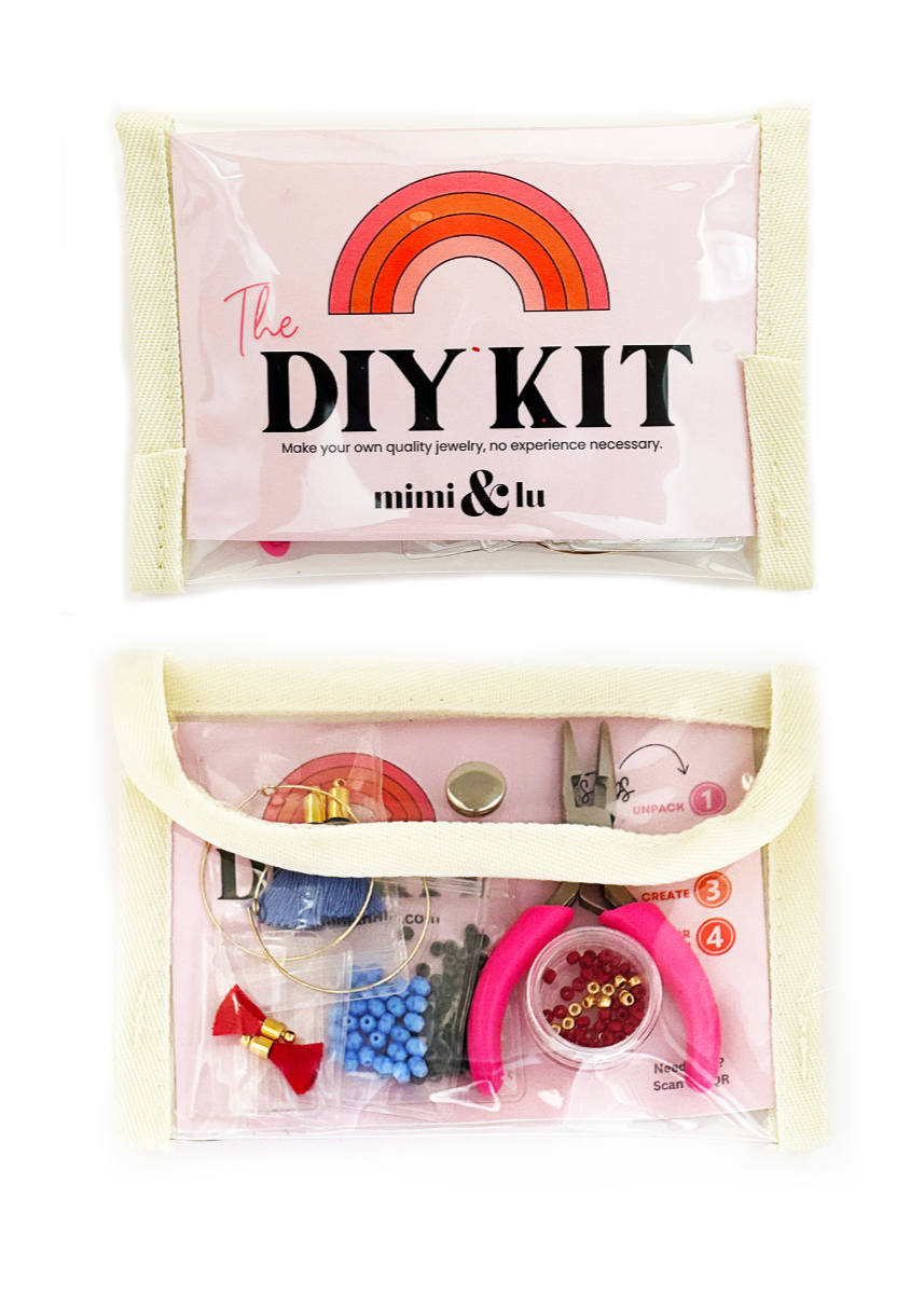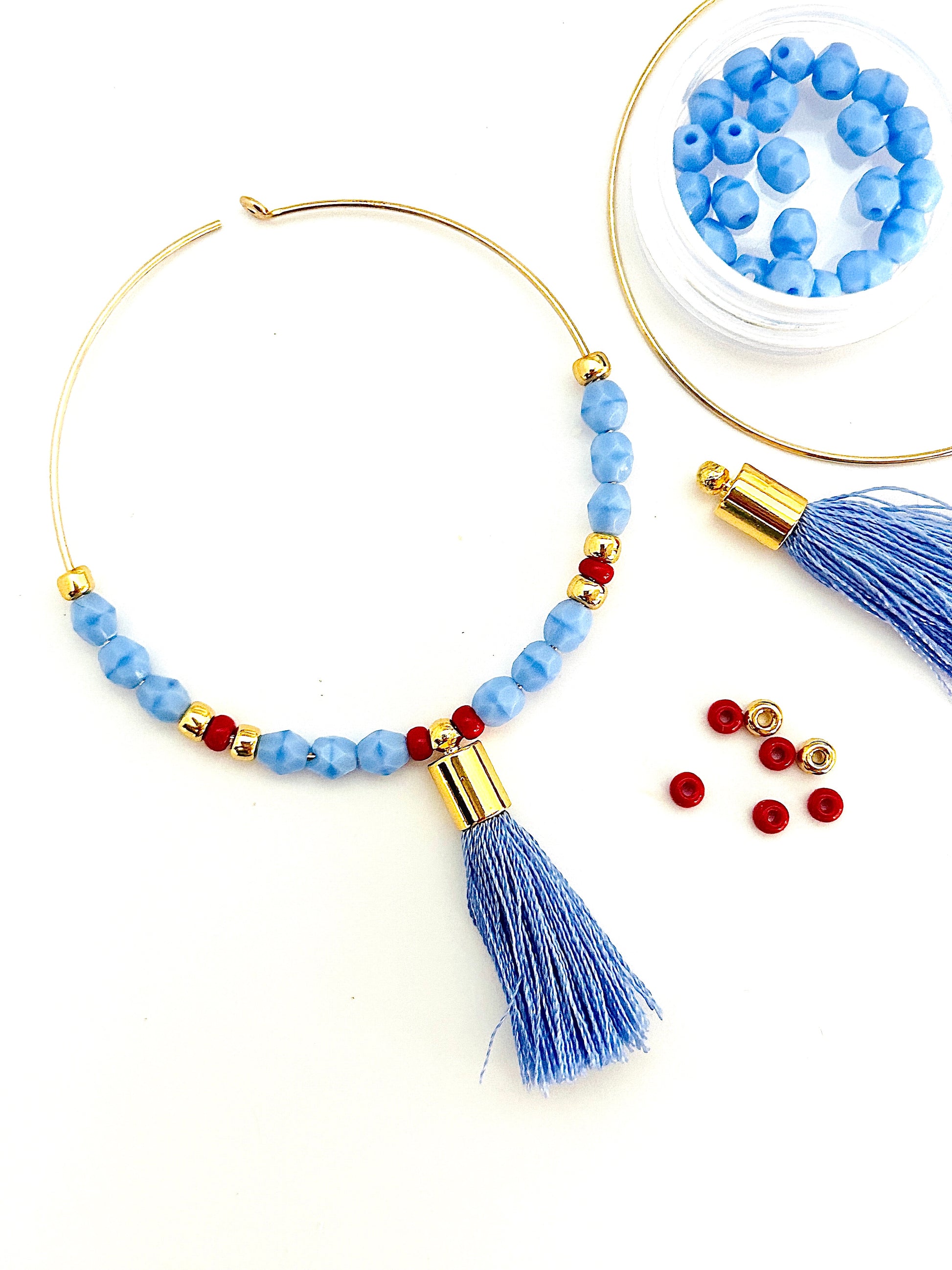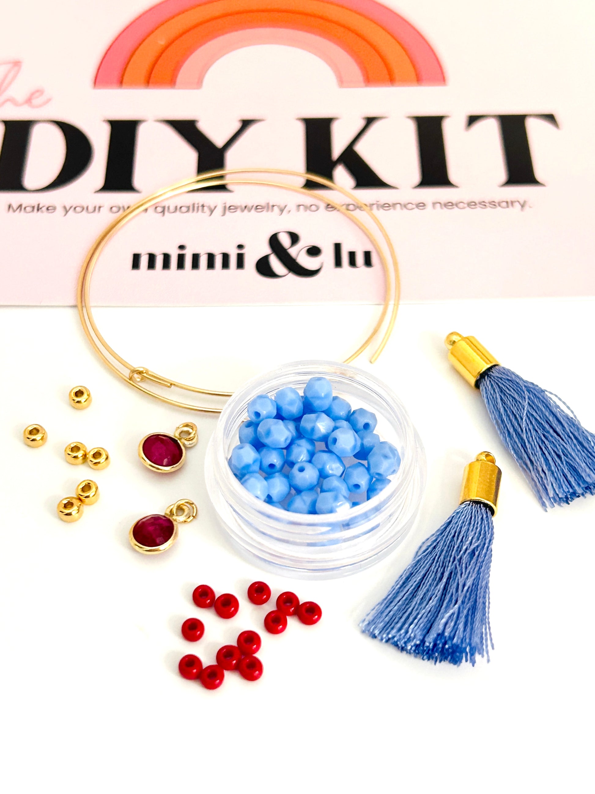 This DIY Ruby Blue beaded hoops kit features a selection of red and periwinkle color beads and tassels, to mix and match. This kit is only available with Gold hoops.