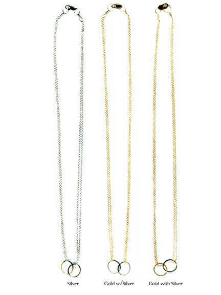 Doubled over chain connects two interlocking rings to compose this dainty and delicate necklace.