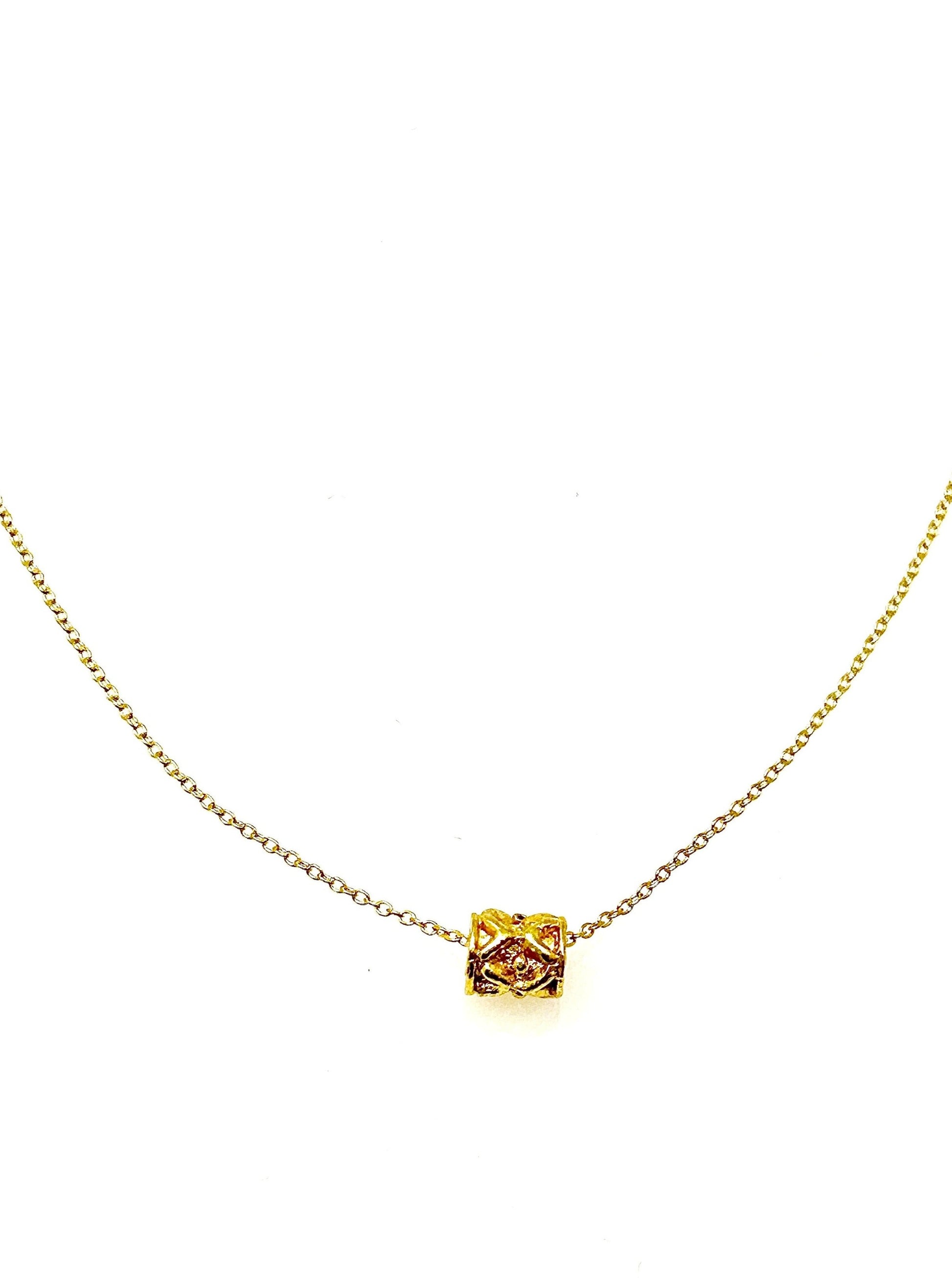 Gabrielle necklace features a 24K Gold plated carved barrel strung onto a 14K Gold fill 18.25" delicate chain. Purchase on it's own or with our Visha and Micro Star necklace as a set.