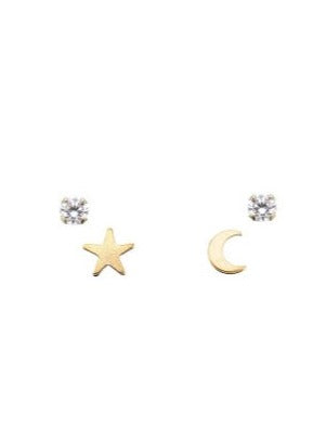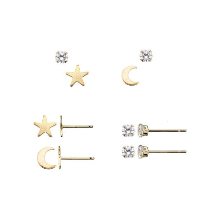 North Star Stud set includes a total of 4 studs- One star, One moon, Two Cubic Zirconia posts earrings. Goldfill.