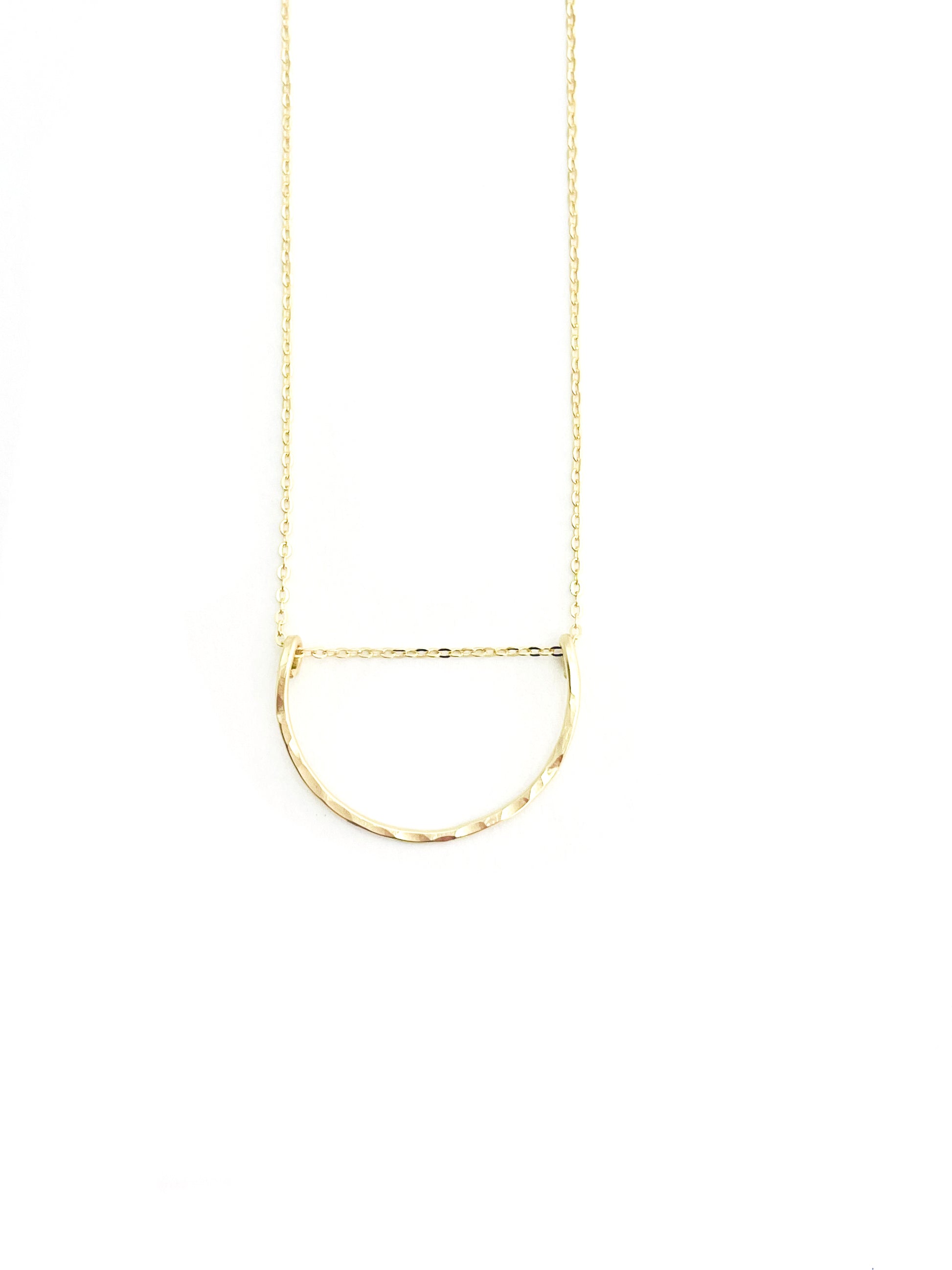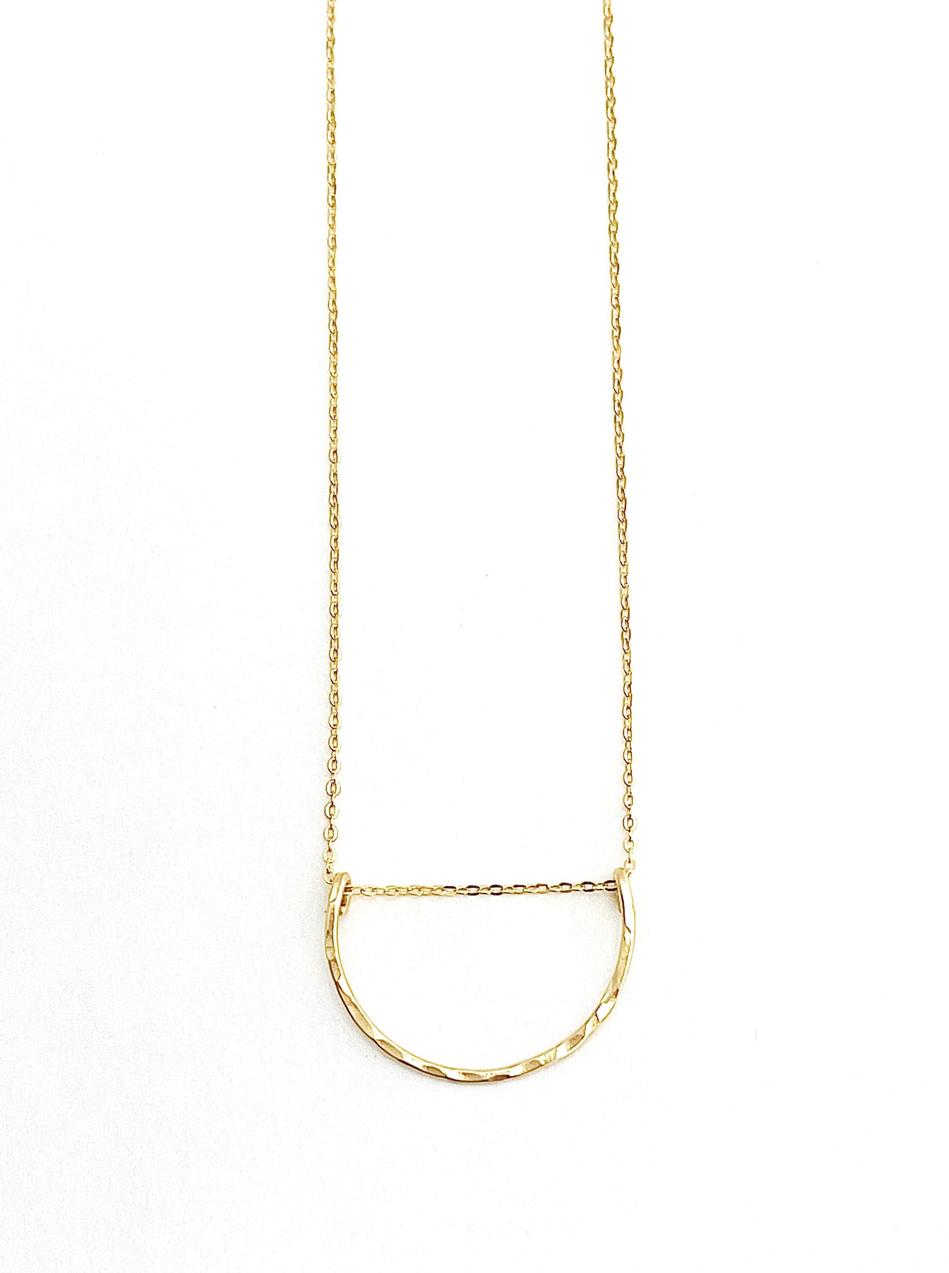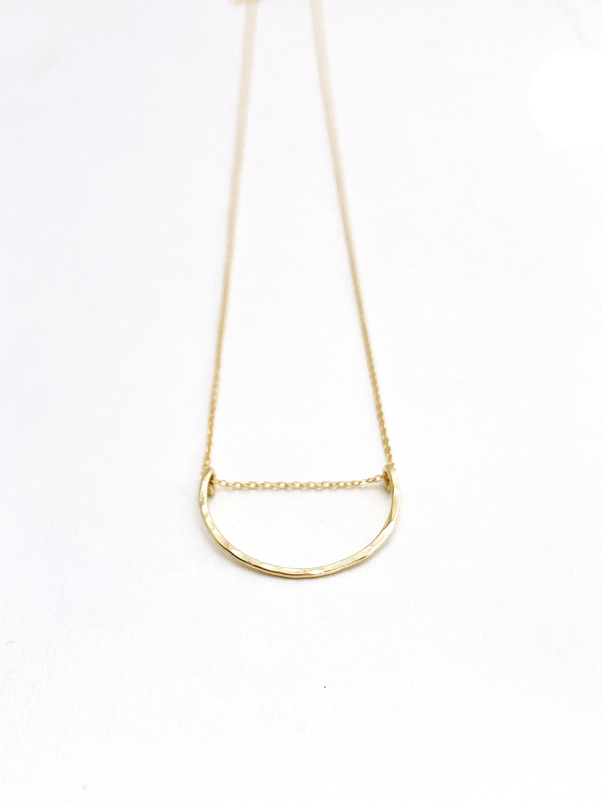The Petite Half Circle necklace is a delicate but detailed piece that is wearable layered or alone. Available in 14K Gold fill or Sterling Silver. Chain approx 18.25" and pendant approximately 1" across. Frame Slides on Chain.