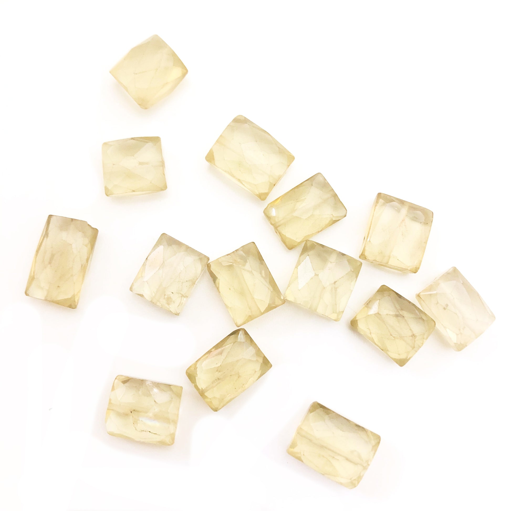 Rectangle Lemon Quartz Drops. Faceted. See photo for size variations. Includes 12 beads. Color is yellow with tinge of green. Some minor inclusions.