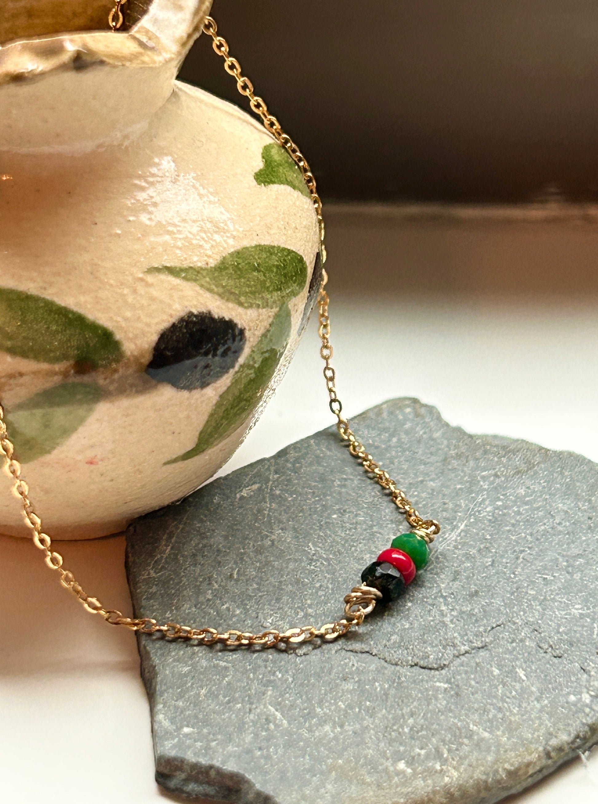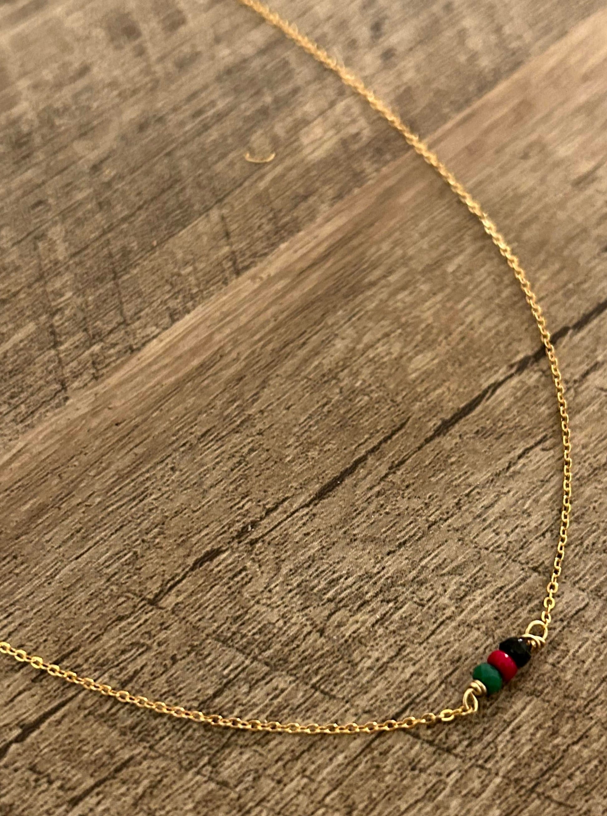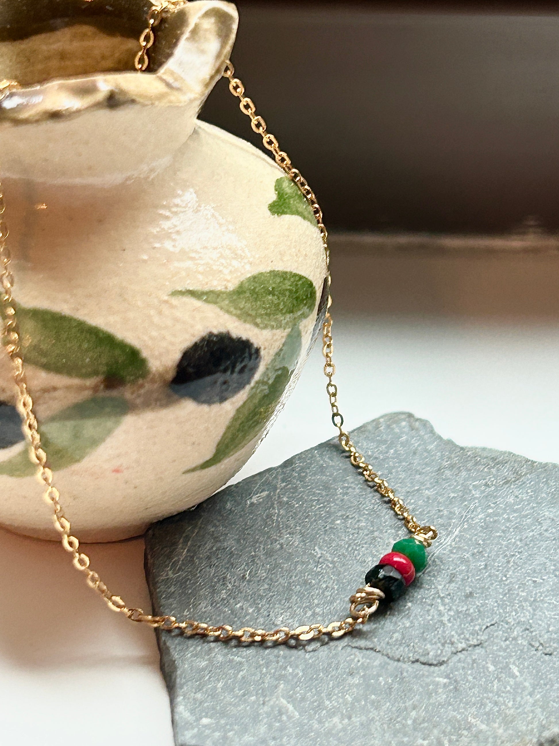 Micro beads in Green, Red and Black built into a 14K Goldfill thin chain. Closure has a small white bead charm. Available in 14", 16" or 18.5". Small bead types may vary but will be micro beads. All net proceeds will be donated to the Palestinian Children's Relief Fund or HEAL Palestine..